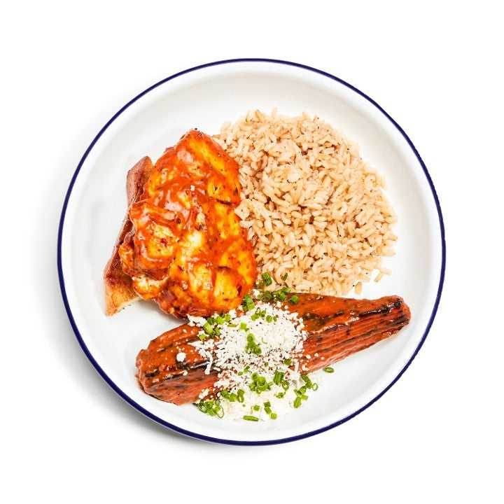 Our juicy, 24-hour brined BONELESS BREAST, fire grilled and brushed with our signature Blackened-chili Garlic Sauce, a slice of grilled brioche toast and two ( 2 ) of your favorite sides.
