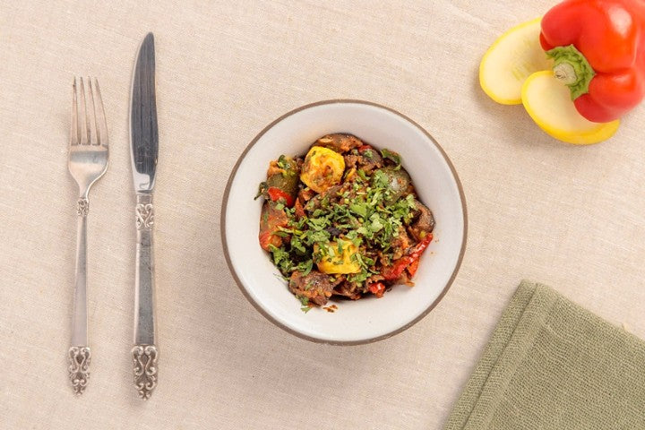 Vegetable ragout with eggplant, zucchini and red bell peppers.