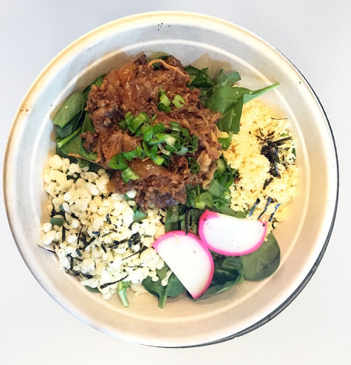 Most POPULAR---Japanese thick Udon Noodle in Katsuobushi soup with baby Spinach, dried nori (seaweed), Crunch powder, Crunch ball, Dried Tofu, Seasoned Spinach, Fish cake, Scallion and soy sauce Marinated Beef on Top.