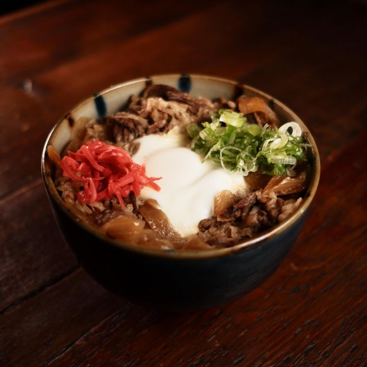 Braised sliced beef and onion with egg, served on white rice with pickled ginger and scallion
