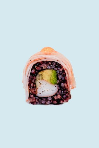 Natural Black Rice, Scottish Salmon, Avocado and Spicy Crab on Top with Eel Sauce