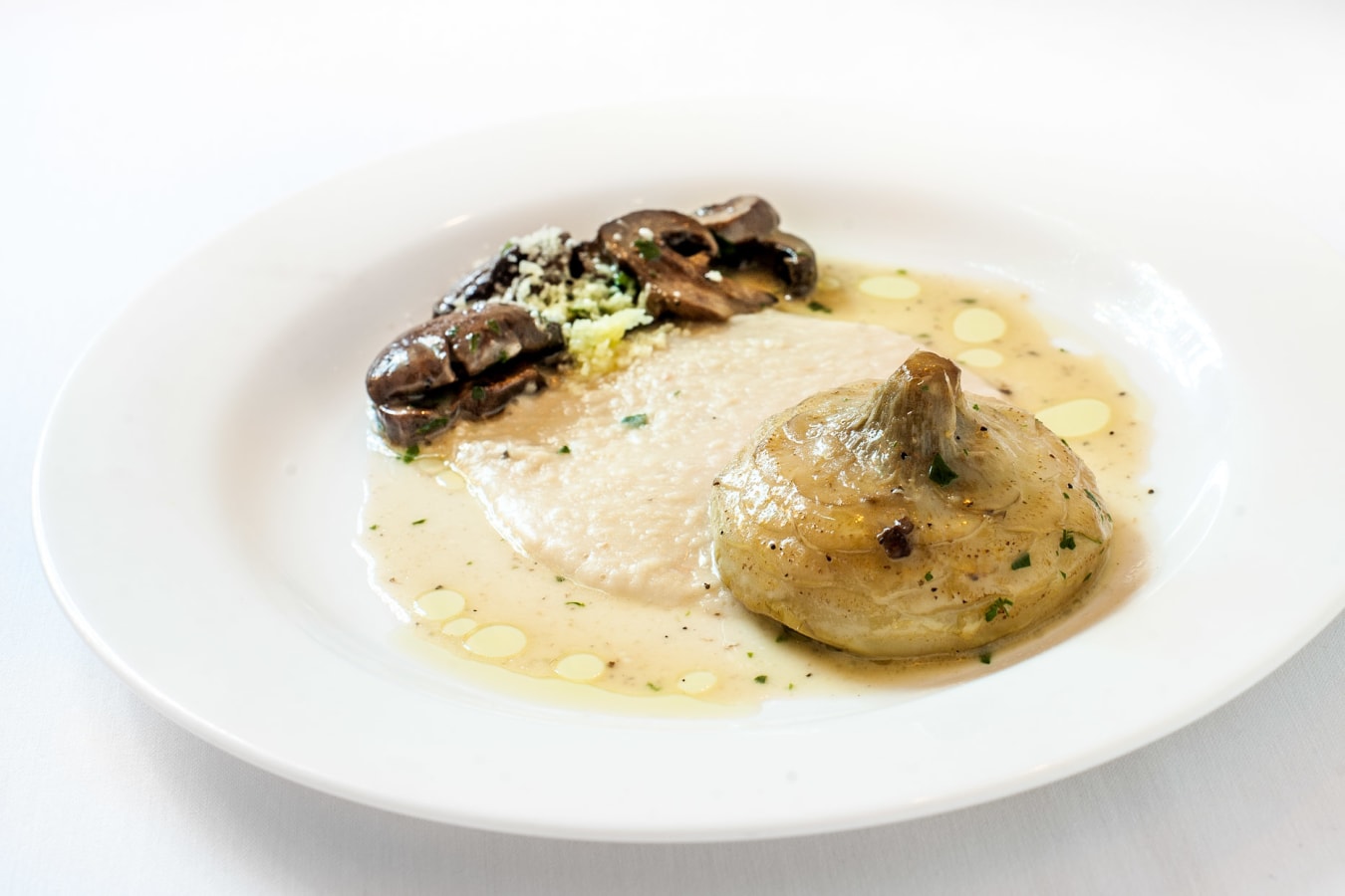 Wood oven roasted artichoke heart white bean puree, and cremini mushrooms