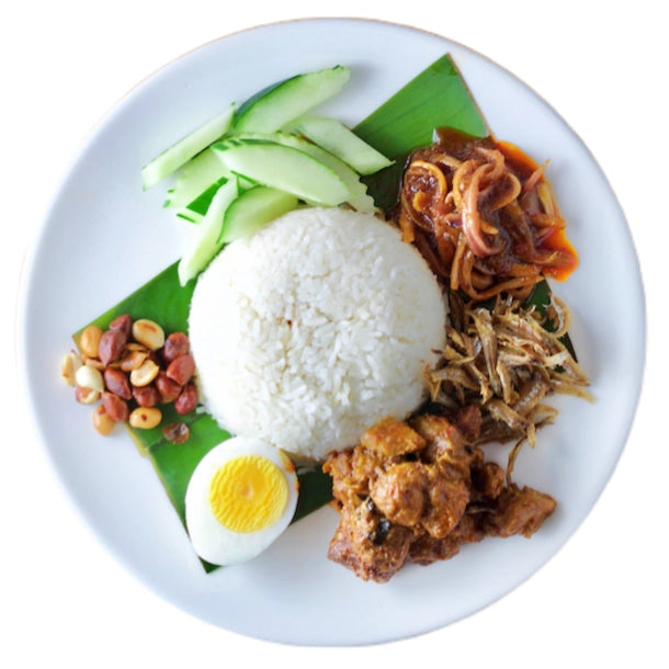 仁当椰浆饭. A popular staple from Malaysia. Fragrant rice cooked in coconut milk served with our chicken or beef Rendang, roasted peanuts, fresh cucumber, crispy anchovies, broiled egg, and house-made sambal chili.