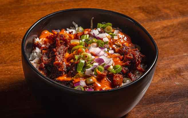 (spicy) Rice topped with Burnt Ends, Chile-Lime Sauce, scallions, and red onions.