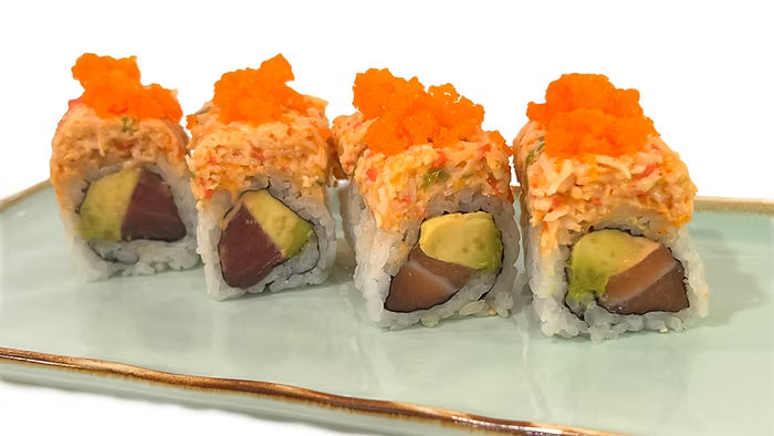 Salmon and tuna rolled inside, topped with a generous amount of spicy kani and a lot of masago.