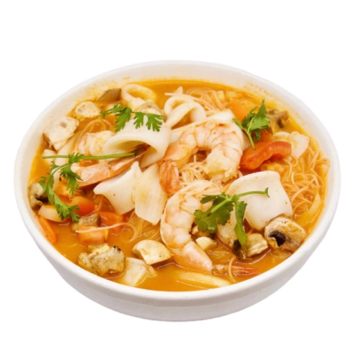 海鲜冬荫米粉. Our signature hot and sour Thai seafood soup served with rice vermicelli and assorted vegetables.