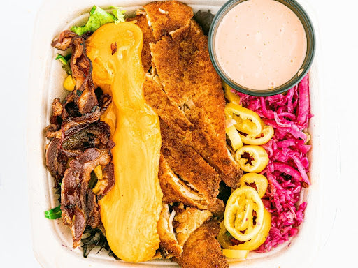 fried chicken topped with lamb bacon, melted cheddar, green papaya slaw, spicy pickled shipka peppers, wolf ketchup