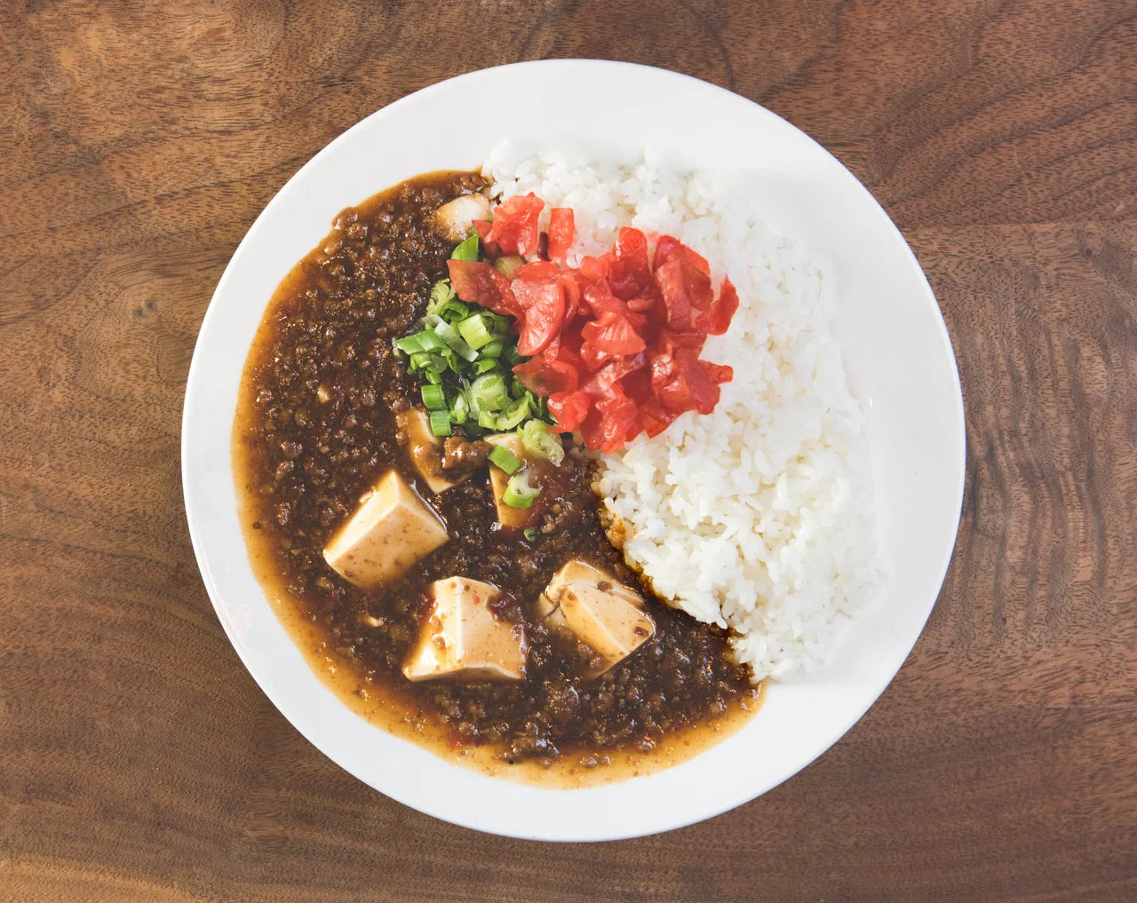 stir-fried ground pork and tofu in a slightly spicy, thick sauce over rice. Gluten Free.