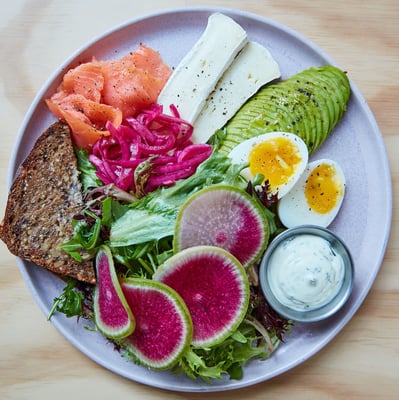 Smoked salmon, avocado, soft boiled egg, greens, brie, toasted rye, dill creme.