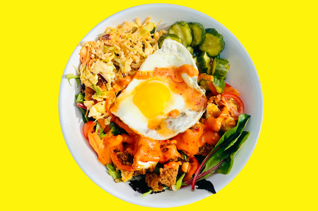 Inspired by Korean bibimbap. Our special-recipe Riverboat Fried Chicken is served over mixed greens, then topped with sauce, Kimchi Koleslaw, Sesame Pickles and a fried egg.