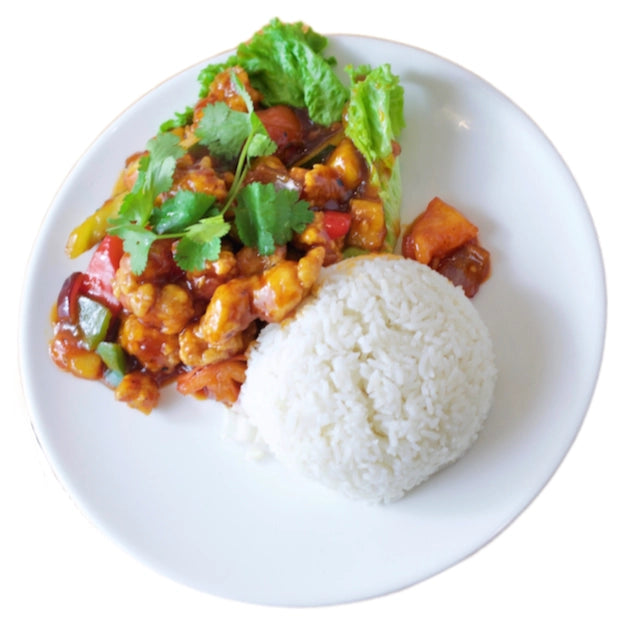 菠萝咕噜饭. A popular Chinese dish worldwide, made with deep-fried chicken or pork, stir-fried with pineapple and vegetables, coated in a luscious and tangy sauce.