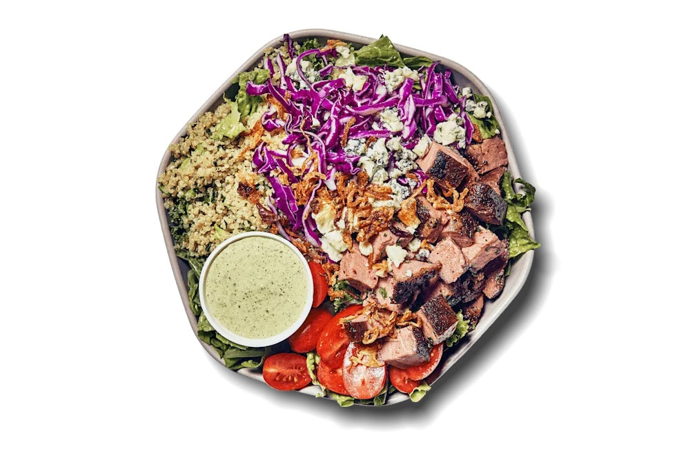 Grass-fed caramelized garlic steak, crispy onions, tomatoes, blue cheese, shredded cabbage, herbed quinoa, chopped romaine and green goddess ranch