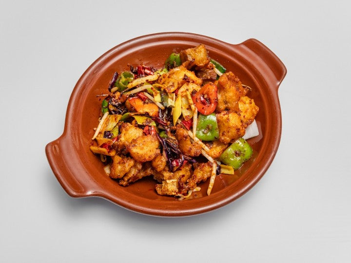 Lightly breaded and fried mixed vegetables (mushroom, cauliflower, caulini, eggplant, potato, and broccoli). Wok stir fried with leeks, purple cabbage, peppers and onions, long hot peppers in a chili oil based sauce.
