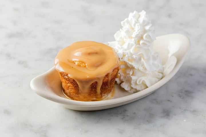 a warm vanilla spongecake soaked in a caramel sauce with whipped cream on the side