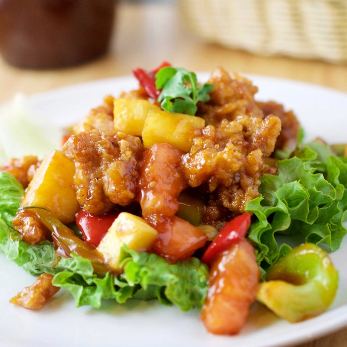 菠萝咕噜. A popular Chinese dish worldwide, made with deep-fried chicken or pork, stir-fried with fresh pineapple and vegetables, coated in a luscious and tangy sauce.