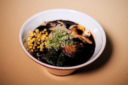 Braised pork bone broth with egg noodles, hard-boiled egg, spinach, braised pork loin, bamboo shoots, scallions and house-made black garlic oil