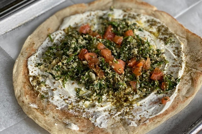 Toasted laffa with Labane tangy yogurt cheese, tabouli, olive oil, and zaa'tar