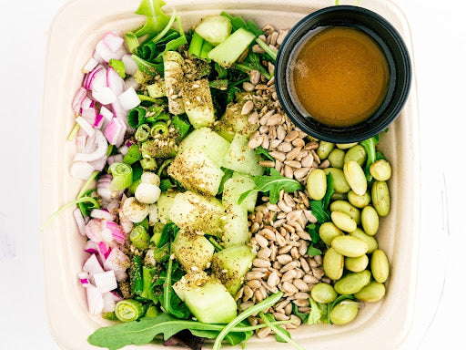 arugula & edamame shallot, melon, toasted pumpkin seed, scallion, zatar, citrus sumac vinaigrette
