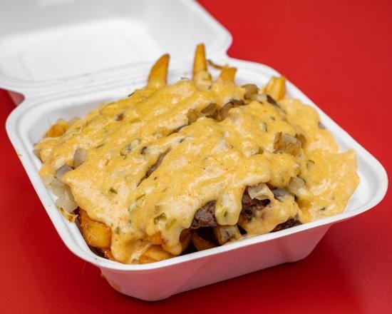 100% all beef burger chopped up with American cheese, grilled onions and house sauce served on fries