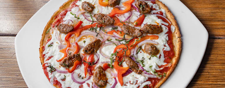 Roasted red pepper, onions, mozzarella, lamb sausage, tomato sauce. Our pizzas are handmade daily using the freshest ingredients to create our famous gluten-free crust.