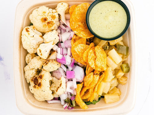 grilled cauliflower topped on spicy pickled pineapple, shallot, bbq potato chips, sage aioli