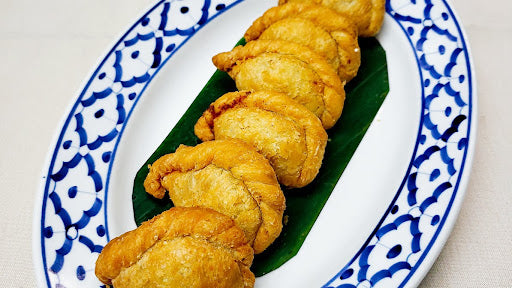 Puff pastry stuffed with minced salmon, garlic, cilantro and white pepper. “Rare & secret recipes from the Thai royal kitchen”.