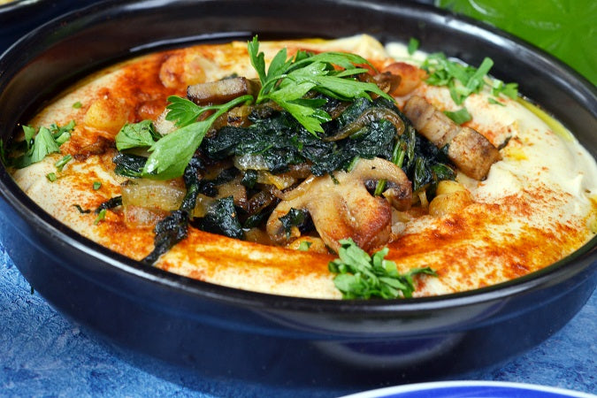 Sautéed onions, mushrooms and greens on a bed of hummus. Served with 2 pitas