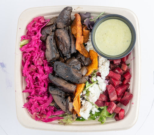 grilled portobello wrapped in beet & chia seed dough green papaya slaw, goat cheese, beets, sweet potato chips, sage aioli.
