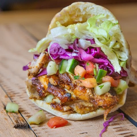 Shawarma, hummus, Israeli salad, red cabbage, lettuce, and tahini.
