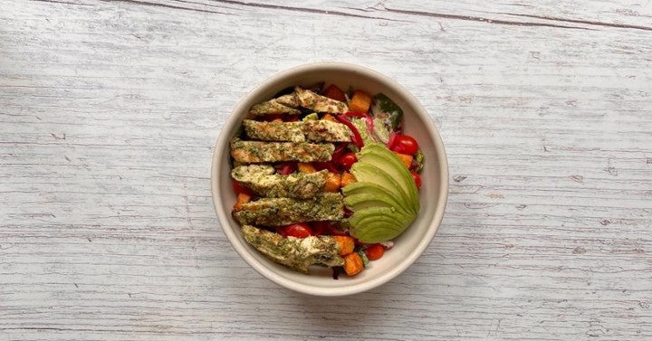 grilled chicken, avocado, radicchio, endive, fried halloumi cheese, cherry tomatoes & pickled onions over baby spinach & romaine w/ basil pesto caesar dressing