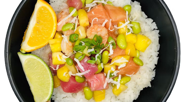 A refreshing combination of salmon, tuna, and shrimp paired with edamame, scallions, and pineapple, all drizzled with ponzu and orange ginger sauce, and finished with a hint of shredded coconut and a splash of lemon for a tropical twist.