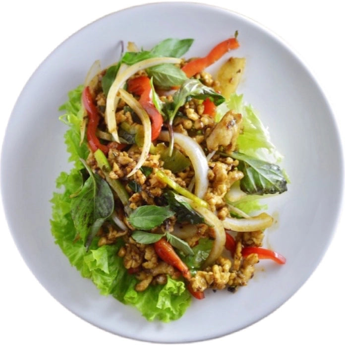 泰式香叶. Stir-fried with garlic, onion, bell pepper, smoked chilis and fresh basil leaves.