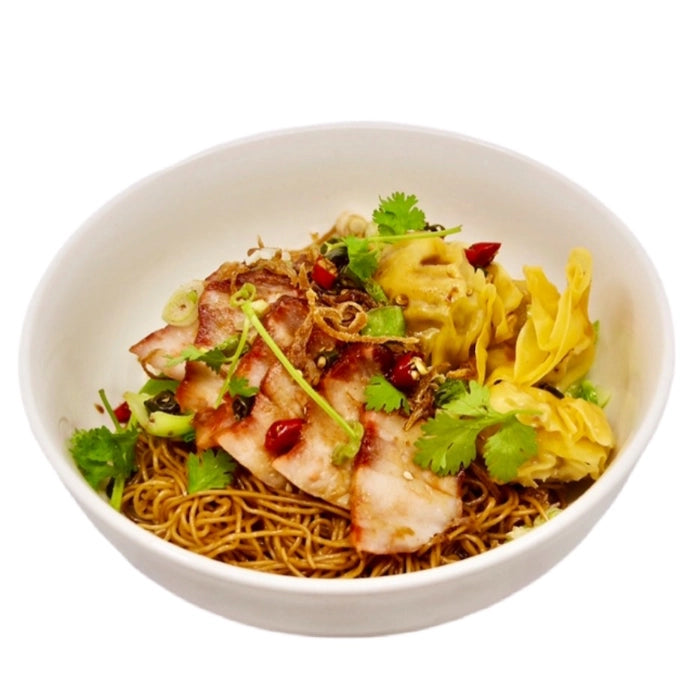 叉烧云吞干捞面. Springy egg noodles tossed in a savory dark soy sauce served with our homemade char siu and wonton dumplings.