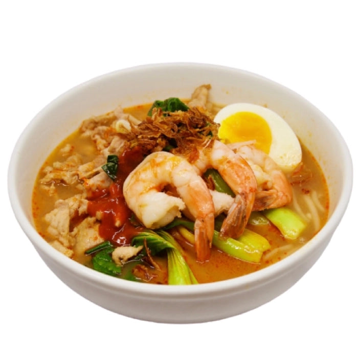 槟城虾米面. A famous noodle dish from Penang, Malaysia. A vibrant, bold yet hearty bowl of flavorful shrimp broth served over yellow egg noodles and rice vermicelli. Topped with slices of pork, shrimp, Asian water spinach, boiled egg and bean sprouts.