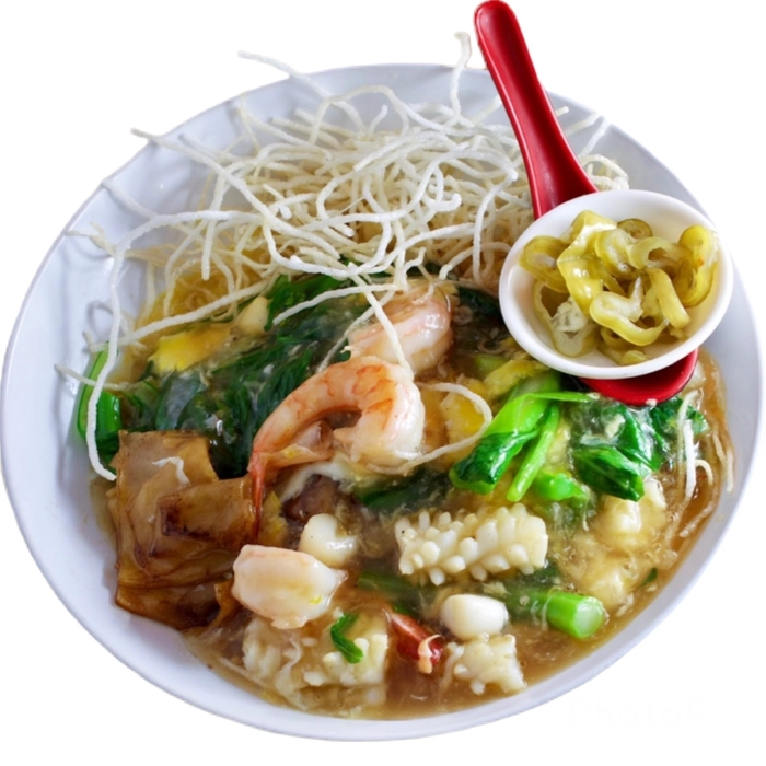 广府炒鸳鸯. Smooth and silky egg gravy cooked with shrimp, calamari, pork and bok choy, poured over crispy and fragrant deep-fried fIat rice noodles and vermicelli before being served immediately.