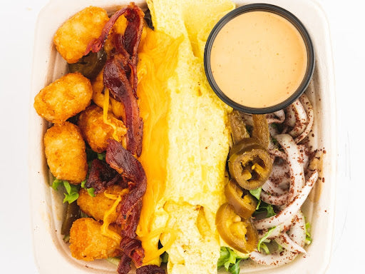 scrambled eggs & lamb bacon melted cheddar, sumac onions, tater tots, pickled jalapeno, chipotle aioli