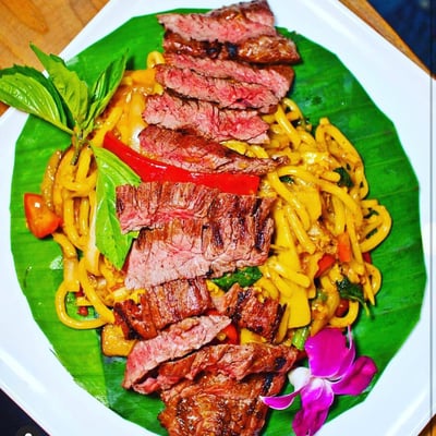Spicy. Fresh udon noodle, chili, carrot, onion, bell pepper, bamboo shoot, string bean, eggplant, basil and egg.