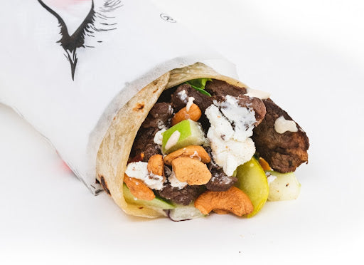 grilled steak wrapped in original flour dough granny smith apples, pickles, toasted cashew nuts, goat cheese, tahini